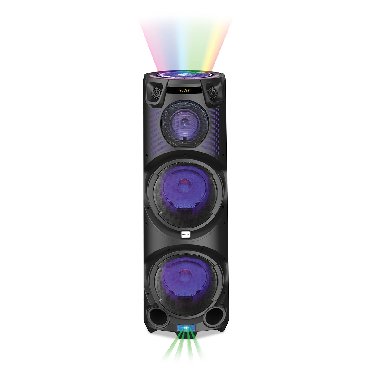 یک ساب ووفر 12 اینچ یک بلندگوی 8 اینچ ، یک میدرنج 5 اینچ و 4 تیوتر + رقص نور لیزری به همراه رقص نور توپی بالای اسپیکر با افکتهای متنوع +قابلیت TWS +دارای ریموت کنترل+ورودی میکروفون به همراه کارائوکه+ورودی اپتیکال+قابلیت تنظیم اکولایزر و تنظیم بیس و تریبل+ورودی گیتار برقی